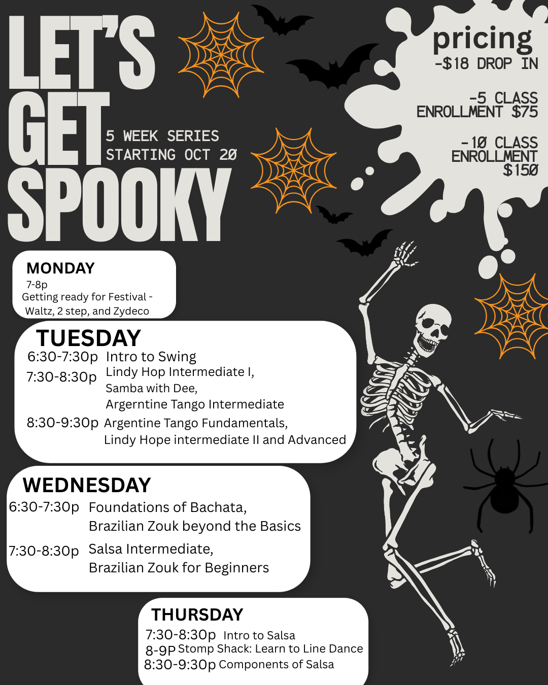 Registration is now open for our Let’s Get Spooky series! Enrollments only for the first week of classes and drop ins accepted throughout the series. Partners not required!